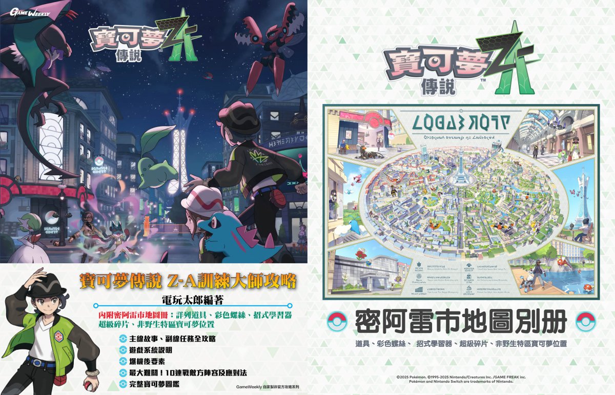 ● 內附密阿雷市地圖冊:詳列道具、彩色螺絲、招式學習器、超級碎片、非野生特區寶可夢位置