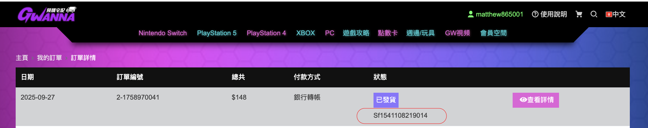 已發貨 - Gwanna 已託運順豐並發出運單編號,並會在下方顯示出順豐運單編號。